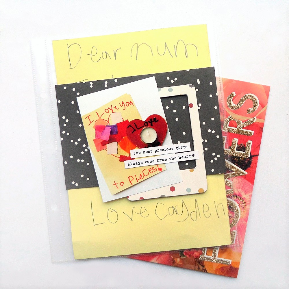6x8 inserts are great for adding cards, extra photos and other memorabilia to your album - I photographed the front of my little guy's handmade card and folded it so that his writing would be easily visible inside the page protector, however I slipped in a 6x4" section of patterned paper inside the pocket so that his sentiments would remain personal.