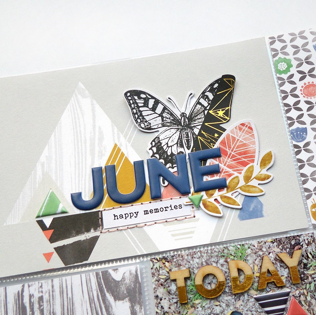 A cluster of cute embellies always works well on the negative space on a photo, and again I went with a mix of different textures to brighten up this pocket and loved the smaller font of the gorgeous foiled wooden alphas.