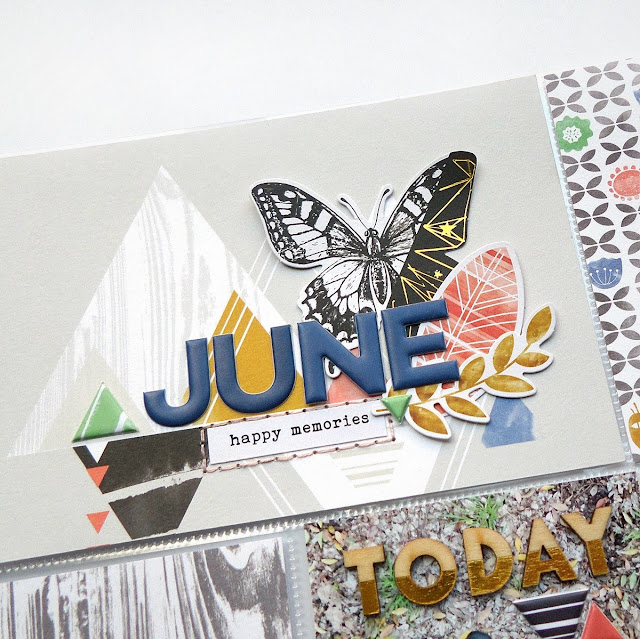 Another thing which drew me to this collection was the range of fantastic embellishments! Gold foiled die-cuts, bright puffy stickers and delicate stitched vellum hearts are just a few of my faves and because I like to create a custom title card for the start of each month and having a mix of textures definitely helps to give the card more interest. I often mix different ranges together and think that the puffy alphas from Pinkfresh Studio's earlier Indigo Hills range work really well with this range.