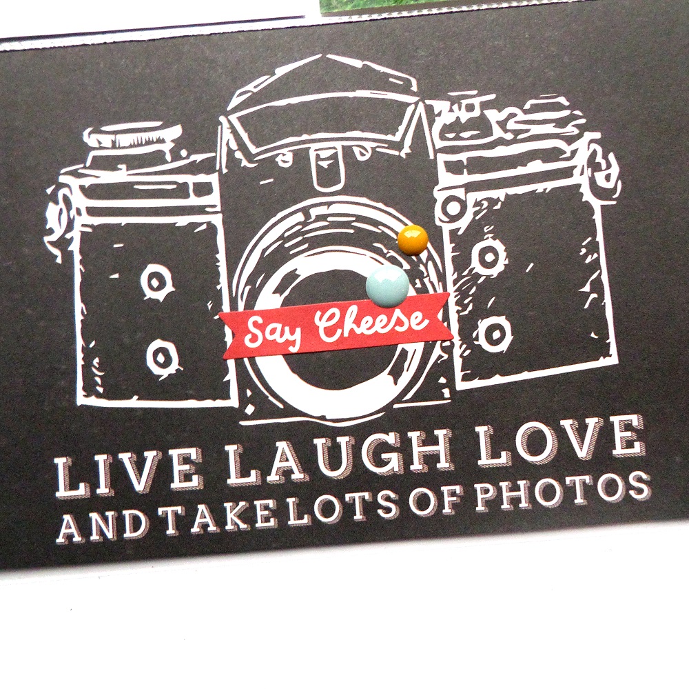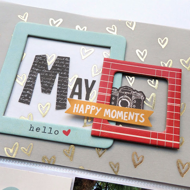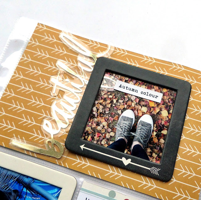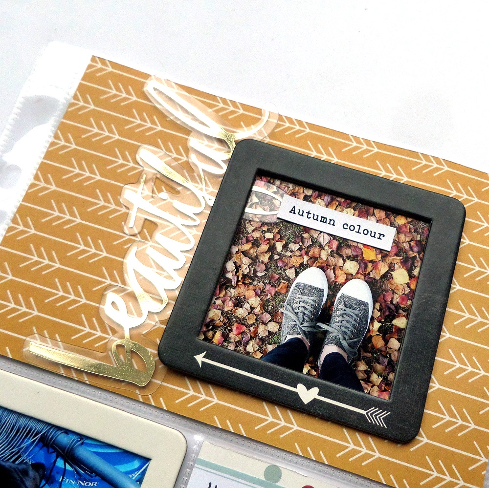 Using the chipboard frames over smaller photos helps to draw the eye to the photo and placing one of the larger acetate words vertically is an easy way to add more visual interest to the page.