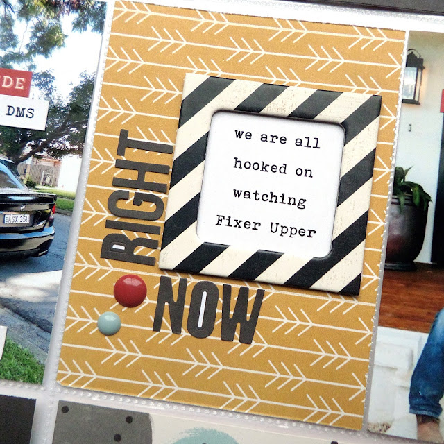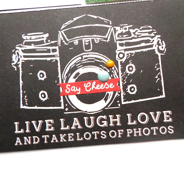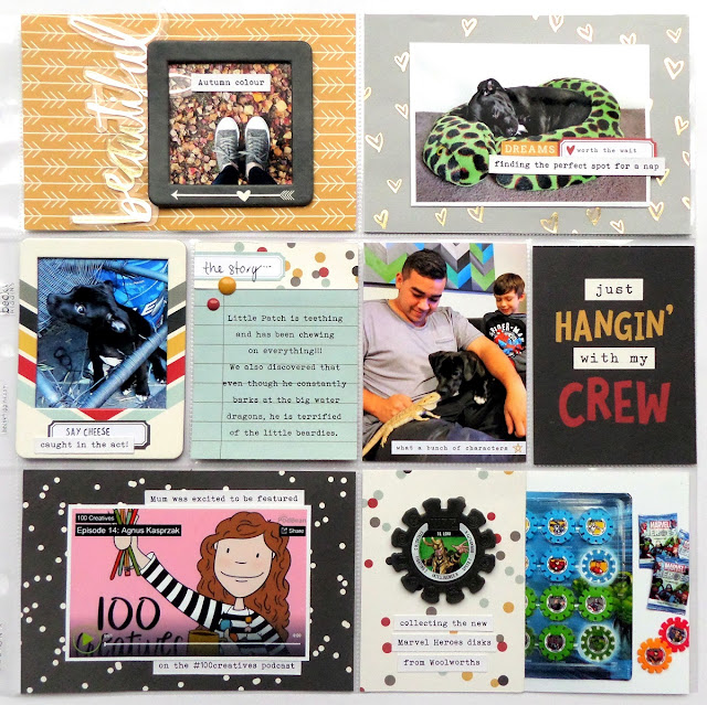 Not all cards in every range are going to work with your stories or photos and instead of simply setting them aside I often try to think of ways that they can be altered and ultimately used in your albums - this card originally had a printed saying on the right hand side and while it was very cute on it's own, it didn't really go with the photos along side it and so I decided to cover up the saying with some printed journaling inside one of the small chipboard frames. I could have left it there and it would have looked fine, but adding the alpha stickers and a few enamel dots really helps to dress up the card.