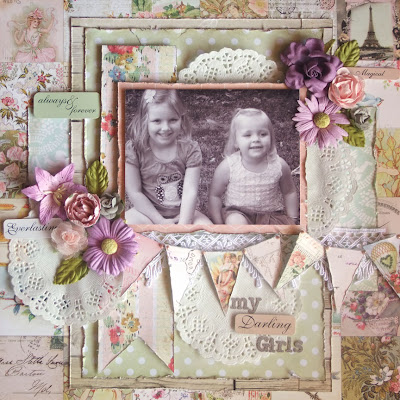 Hi There!Shell with you today. I've been playing with the gorgeous Prima Divine collection this month & I'm still crushing on the shabby chic goodness of it all! With a beautiful soft palette & gorgeous vintage images it is so much fun to work with!My girls asked me to take a few photos of them out the front of the house the other day. They love posing a saying 'I'm a fashionista'. I think I have 2 little Divas on my hands! Because they are usually goofing around & totally over posing it is hard to get a nice shot but I did mange to get them to sit still for about 2 minutes for this photo!