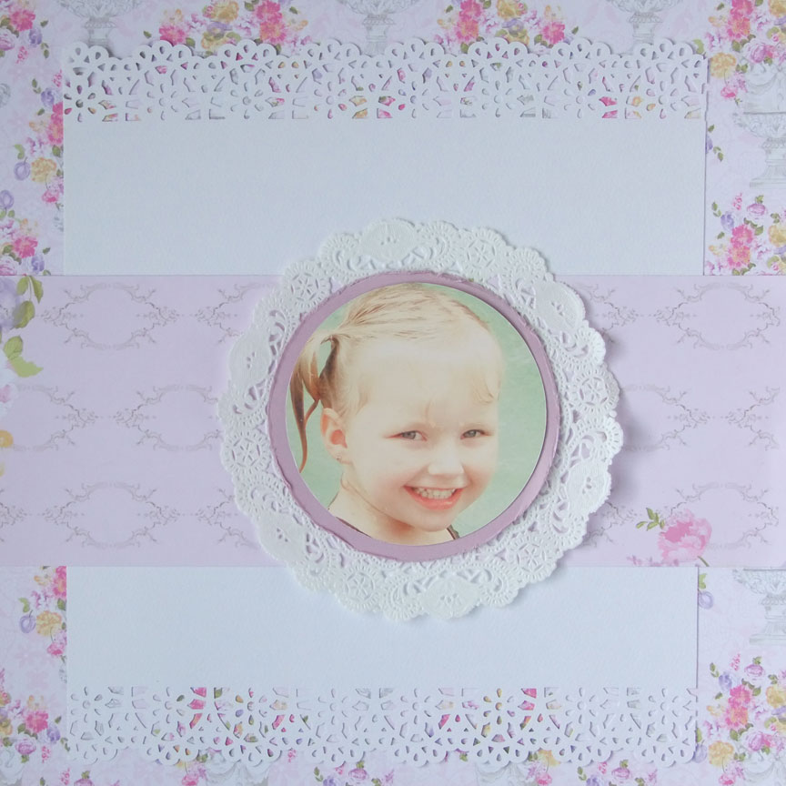 Cut your photo using a 4" cirlce. Cut a photo mat from Kaisercraft Lollypop Weave 4.5" circle. I have used a 6" paper doily but you could use a 6" plain circle, scallop circle or die cut. Stick these altogether on top of the Floralee paper sitting slightly to the right side (don't stick all the way down just yet as you will need to do the next step first)