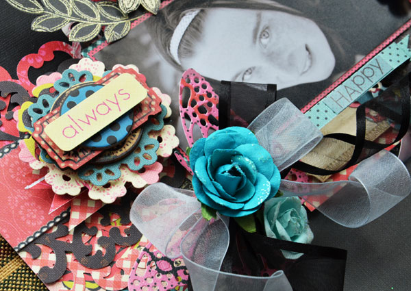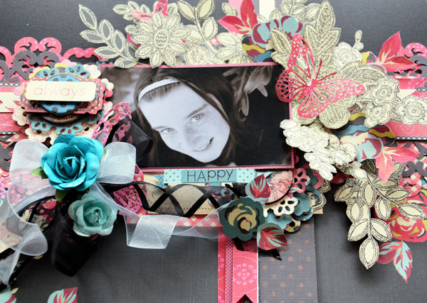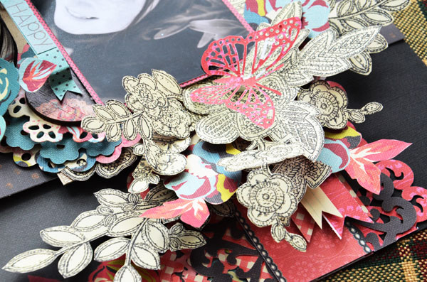 Once again my page is packed with dimension. The pattern on the backside of the DARBY patterned paper was fussy cut and layered and then to add a splash of colour I also fussy cut some of the flowers from the OLD GARDEN patterned paper to create my corner cluster.