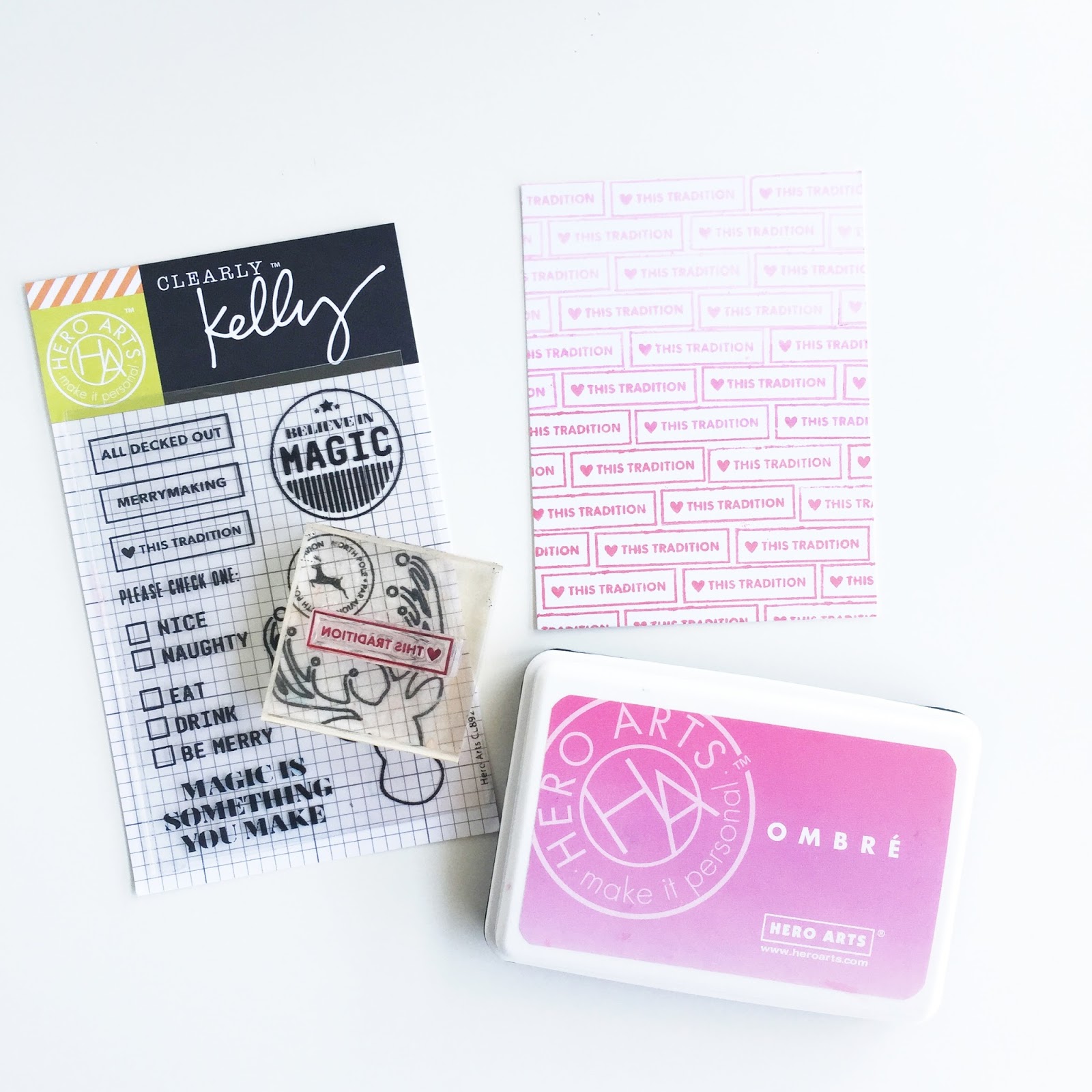step 1: Trim a 3”x4” piece of smooth white cardstock and stamp a brick wall pattern using the Kelly Purkey | Deck the Halls clear stamps and Hero Arts ombre ink. See instructions here.