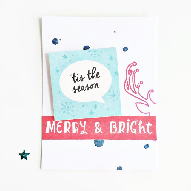 step 3: Flick a few drops of Heidi Swapp colorshine | Navy directly on to the card. Trim the "Merry & Bright" banner from the October Afternoon | Under The Tree Merry Making paper. Layer near the bottom of the card.