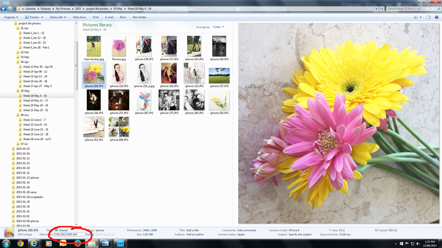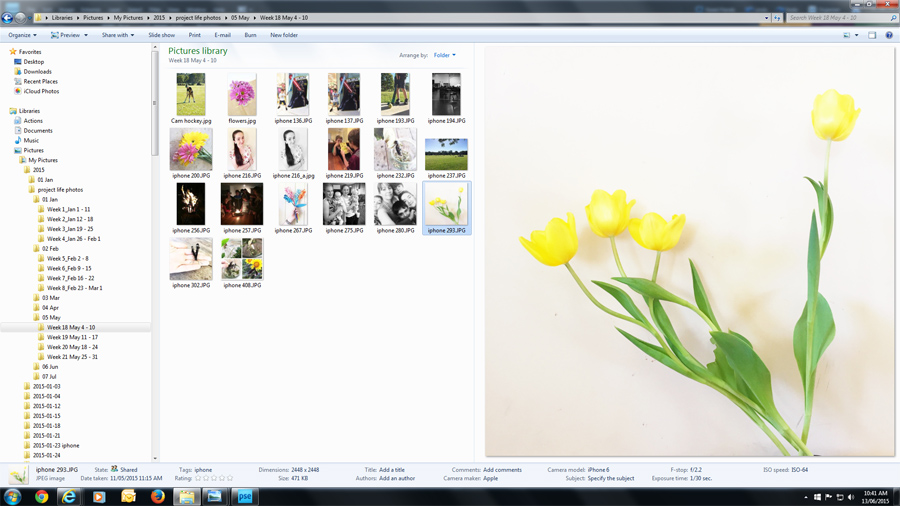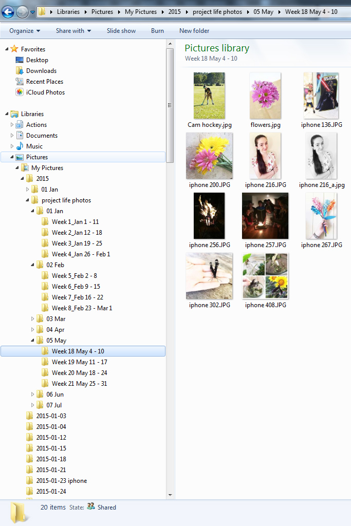 I have organised my photos into the following system. Pictures > 2015 > Project Life Photos > 01 Jan > Week 1_Jan 1-11. I always label my months with a number first. For example: 01 Jan, 02 Feb, 03 Mar. This way the folders will stay in consecutive order rather than alphabetical.