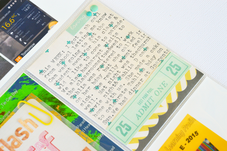 Still on the weather theme, I used the Crate Paper Poolside patterned paper with the plus symbol to type my journaling on to. It reminded me of rain falling from the sky. *grin*