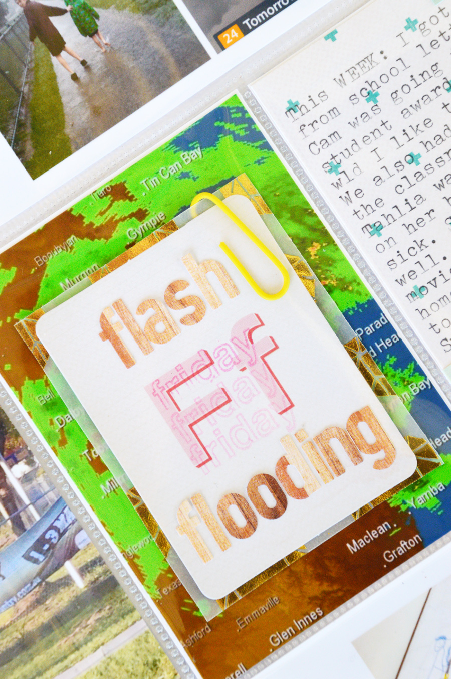 The "F" flashcard in the Crate Paper Poolside ephemera pack was altered to complement my journaling. It was layered on gold foil vellum, which was then layered on top of a screen shot of our local weather.