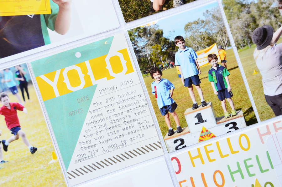 This week I've chosen to add pops of yellow across my spread, teamed with sweet touches of minty green. The yellow from the patterned paper filler cards complements the boys hockey uniforms and a nice, bright certificate award from school!