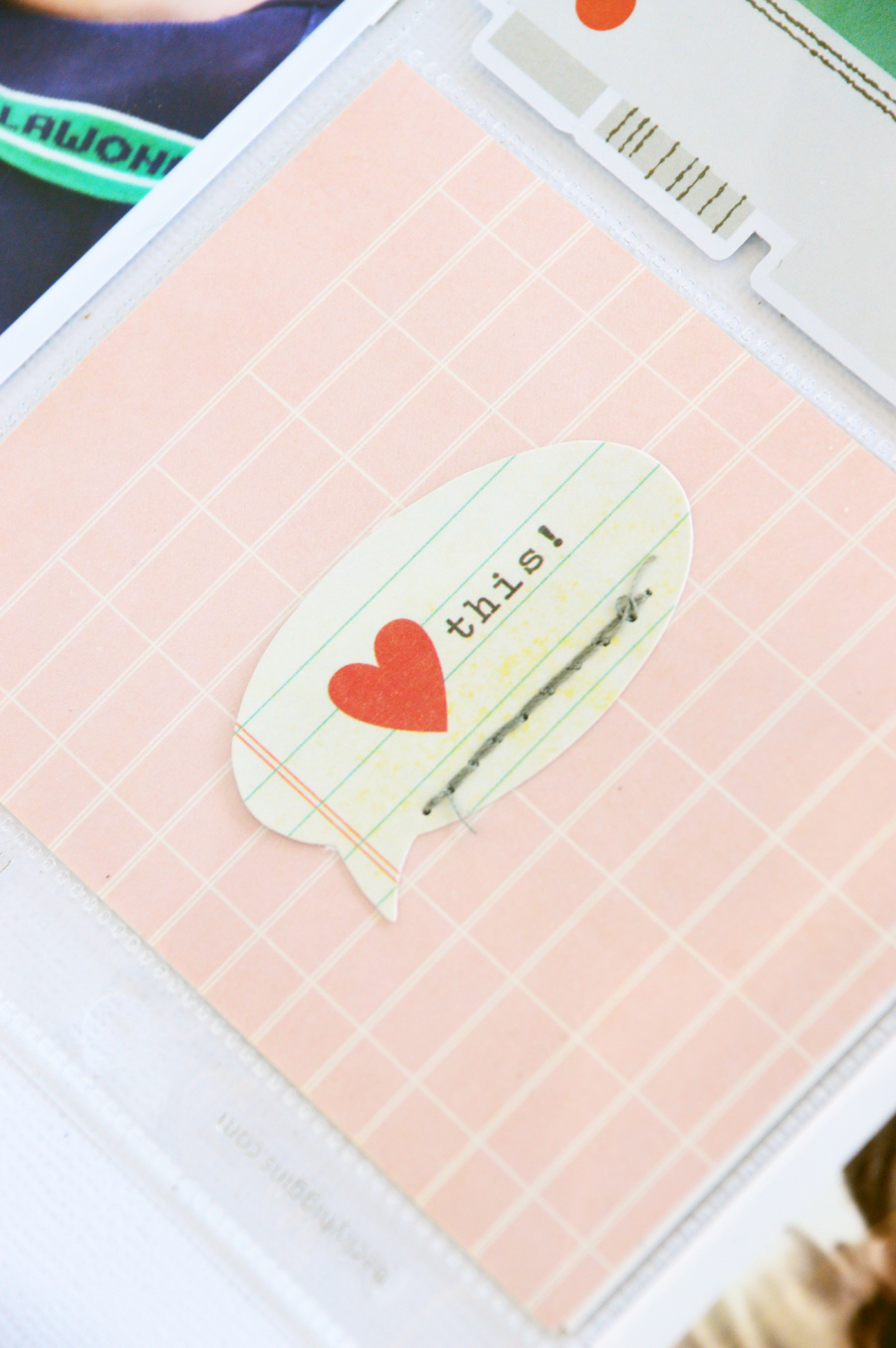 Finally, my filler cards have also been left relatively simple. On the pink 3x4 journaling card, I've machine stitched a speech bubble die cut from the Bits & Pieces ephemera pack, directly to it. I've used grey thread rather than white for noticeable dimension.