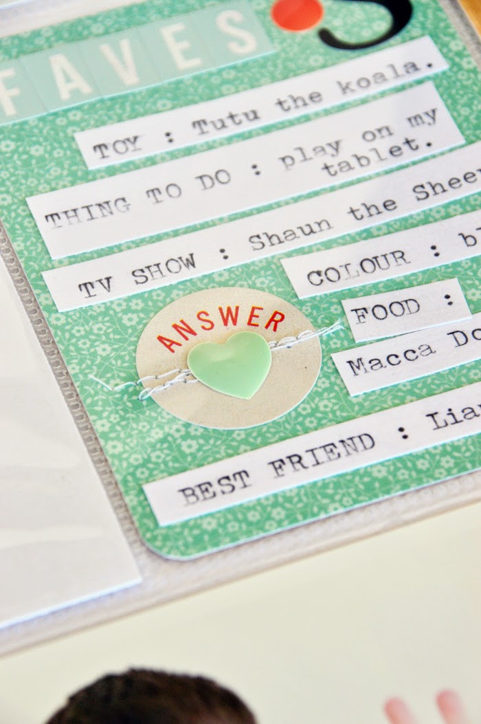 As a journaling feature this week, I thought I would ask my five year old what his favourite things are right now. I labelled his cute answers in paper strips directly to a PL card.
