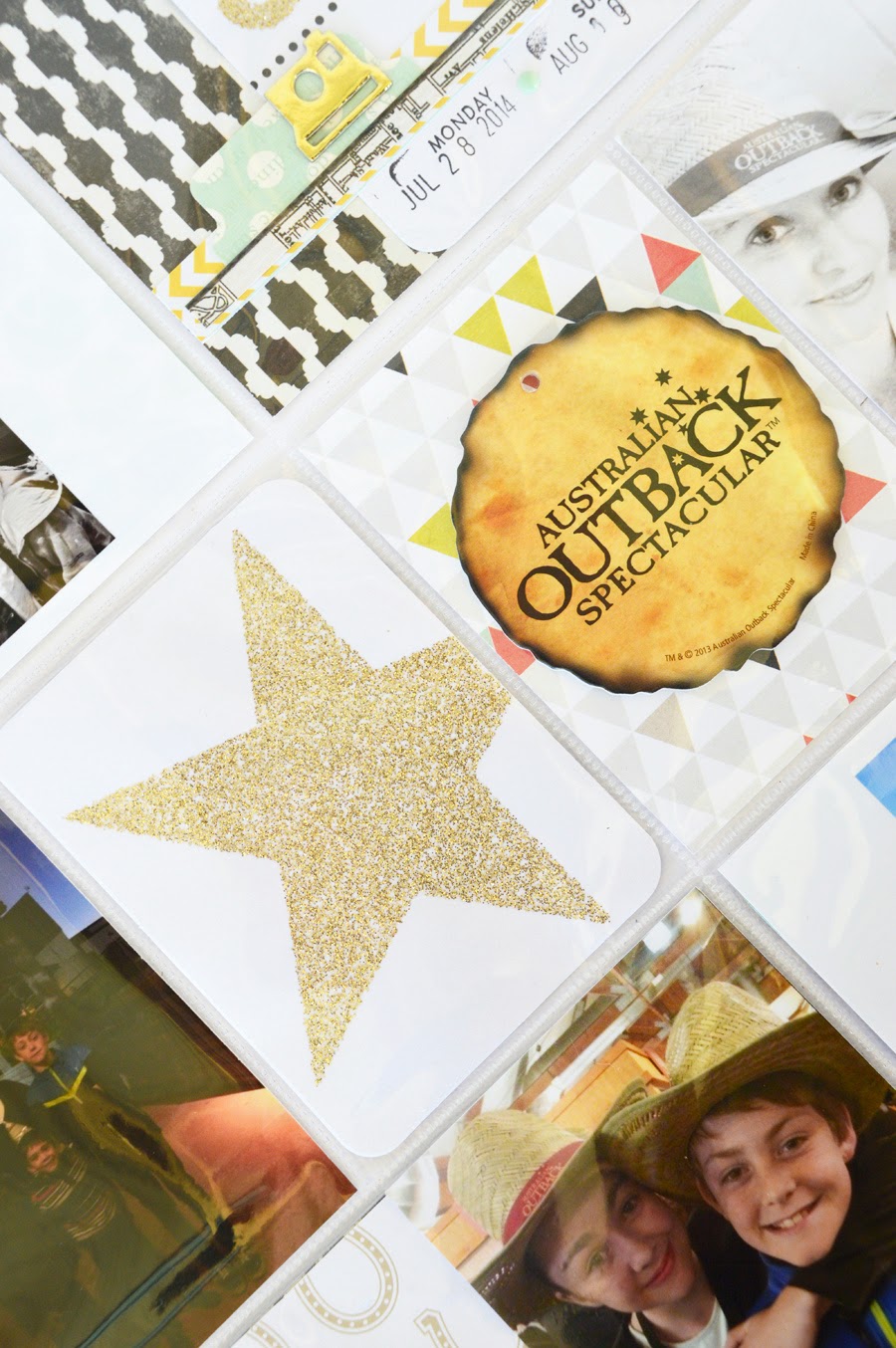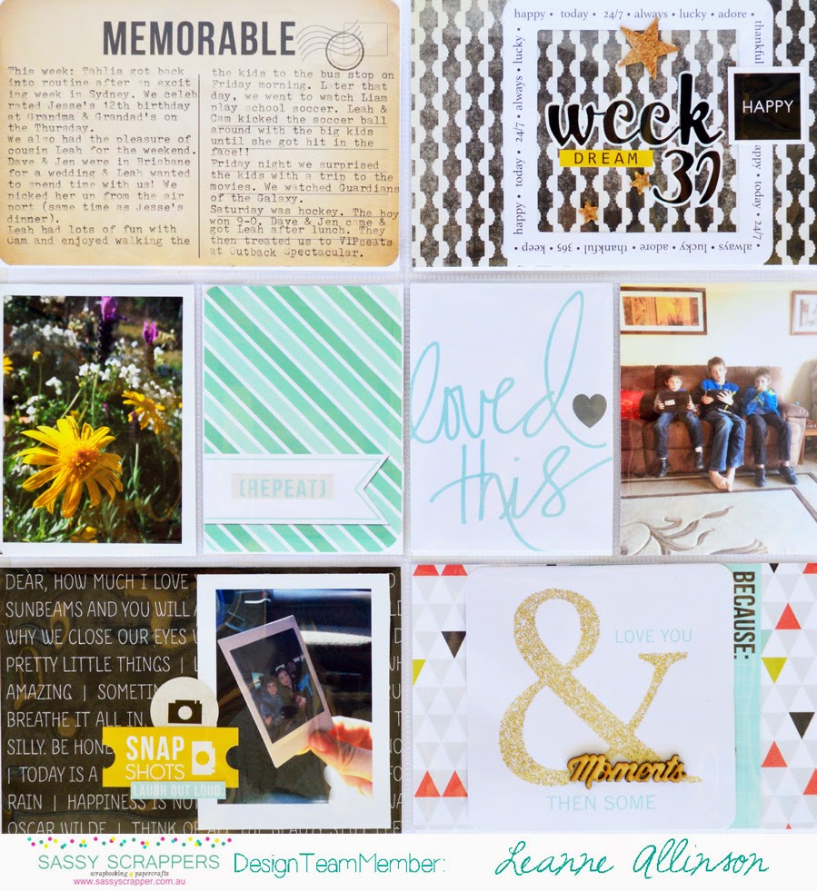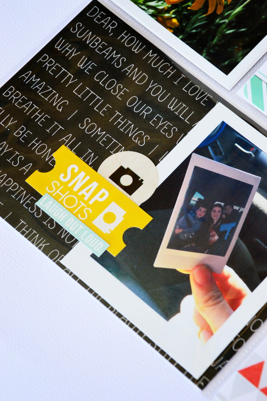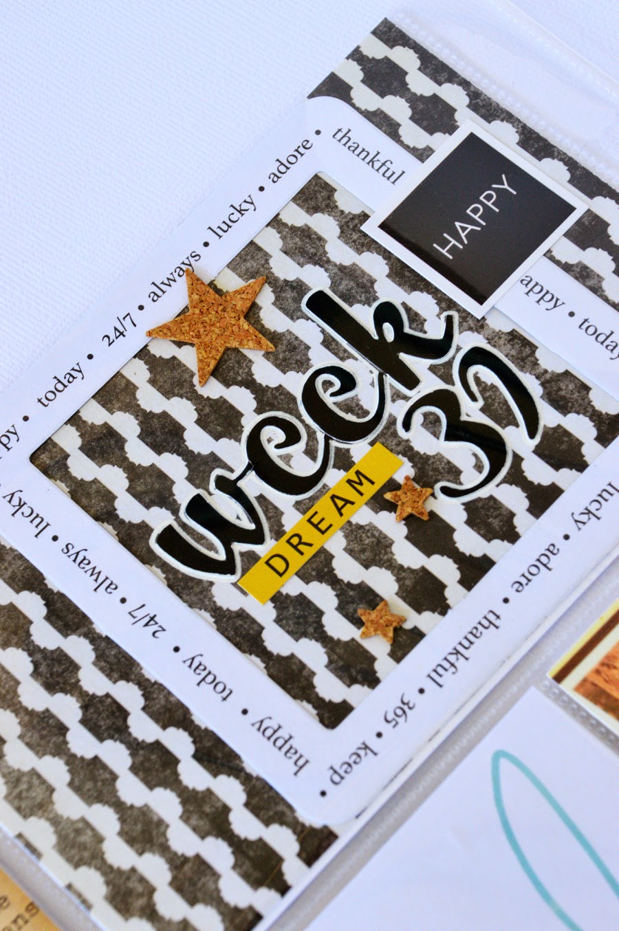I quite like to 'mix it up' with different shapes as my layers. As long as my pockets don't become too bulky, I am more than happy to experiment. This week for my title pocket, I've used the 4"x4" frame to highlight my black alphas on a black and white background. The frame draws attention to the pocket without it being out of place with the rest of the spread. To prevent the alphas from completely disappearing against the backdrop, I've outlined them with a white gel pen.