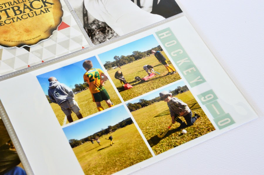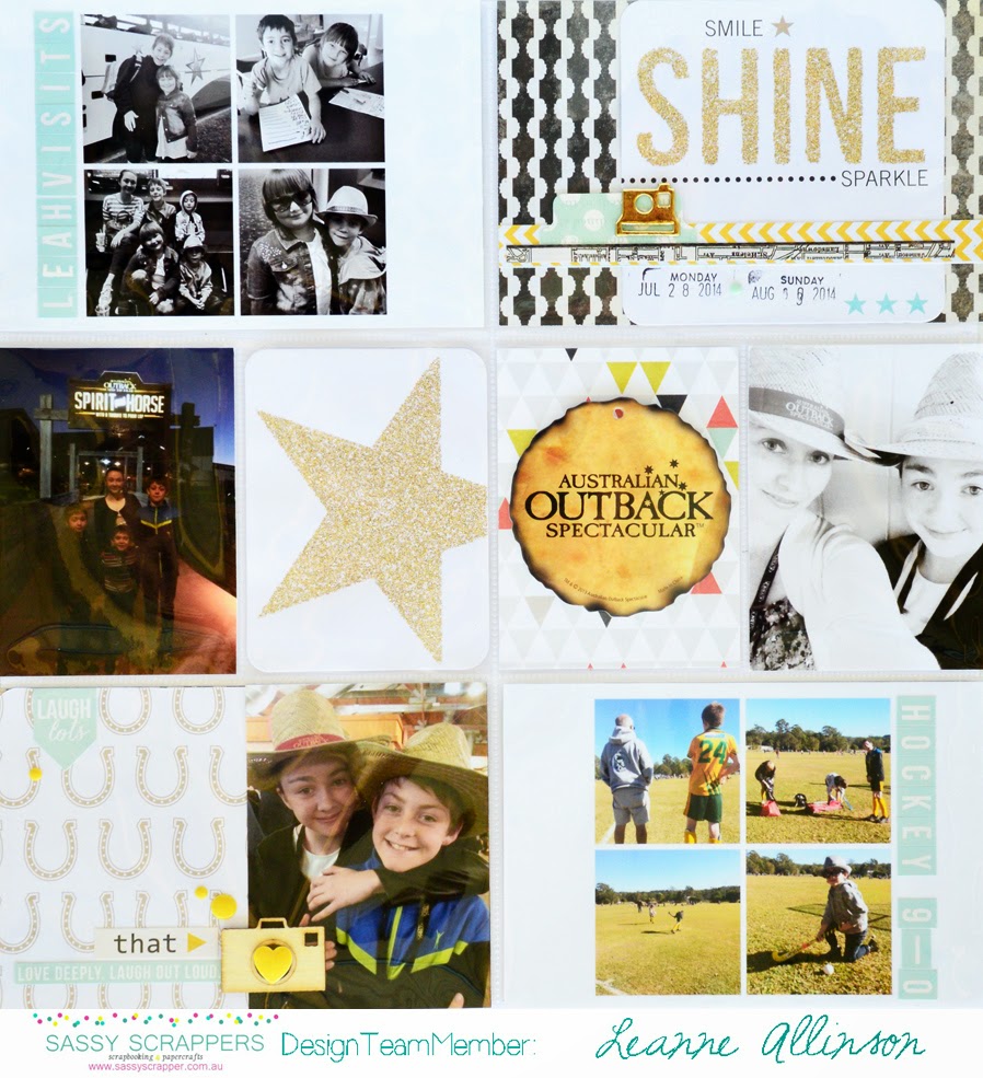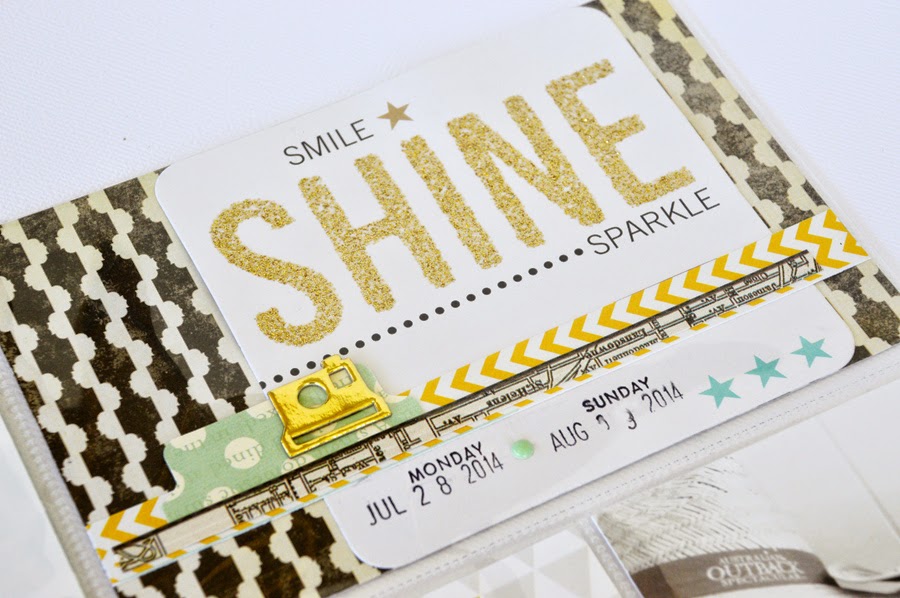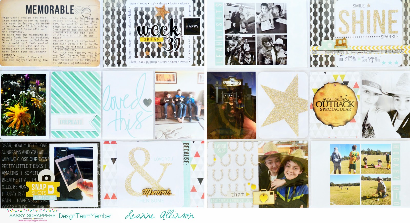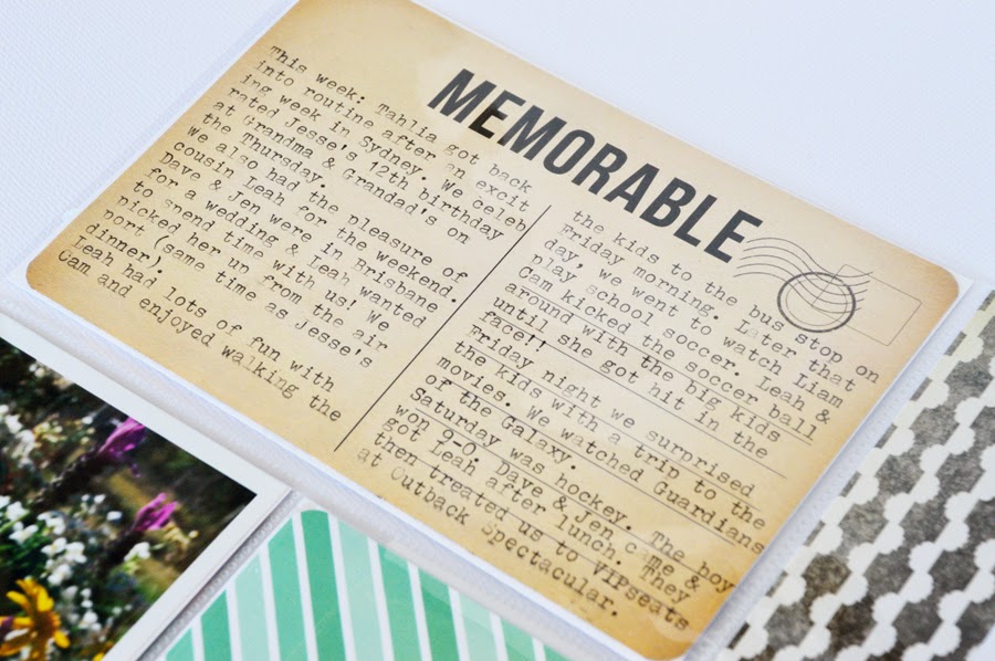 I quite like to 'mix it up' with different shapes as my layers. As long as my pockets don't become too bulky, I am more than happy to experiment. This week for my title pocket, I've used the 4"x4" frame to highlight my black alphas on a black and white background. The frame draws attention to the pocket without it being out of place with the rest of the spread. To prevent the alphas from completely disappearing against the backdrop, I've outlined them with a white gel pen.