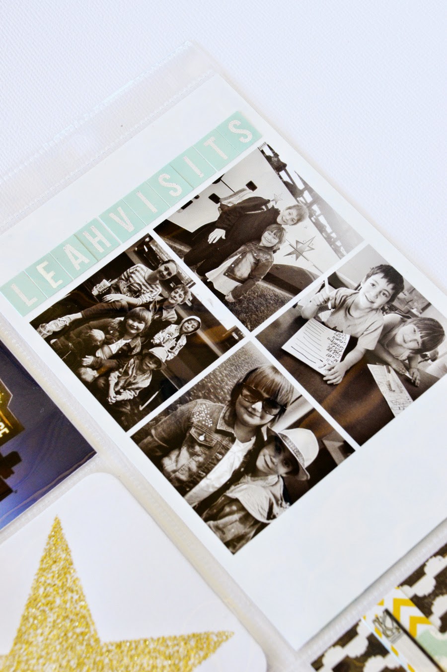 The rest of the pockets on page one still have layers but instead of the PL cards, I've played with the stickers found in the kit. I particularly like the camera images linked with a photograph of a photograph! *grin*