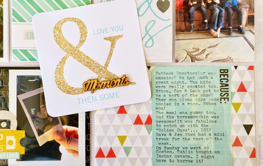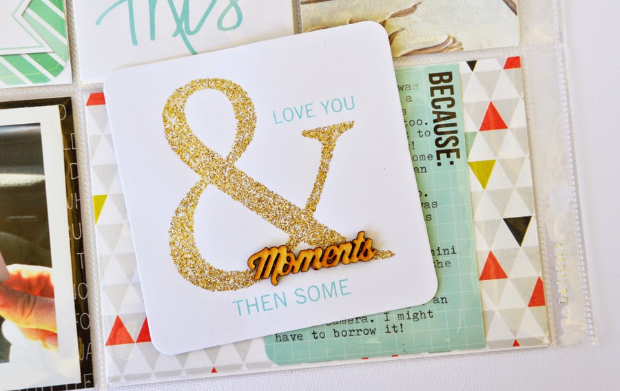 I trimmed a 4"x6" Captured Moments PL card, just above the 'because' text. I placed it directly into my typewriter and added my journaling before adhering it to the background patterned paper. The 'ampersand' PL card simply slips over the top, revealing the edge of the other PL card beneath.