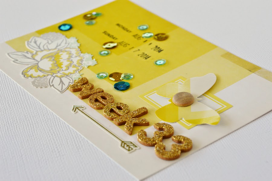 I added the Maggie Holmes gold thickers to help capture the gold highlights in the journaling cards and grounded them with sequins. The arrow, butterfly and flower stickers were taken from the Nine & Co Decorative Stickers. The butterfly sticker was mounted on foam dots and then on top of a Studio Calico label, for a little extra depth.