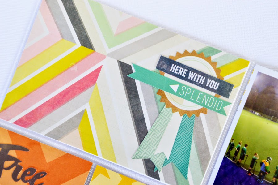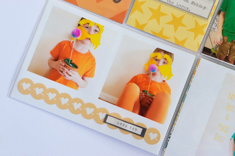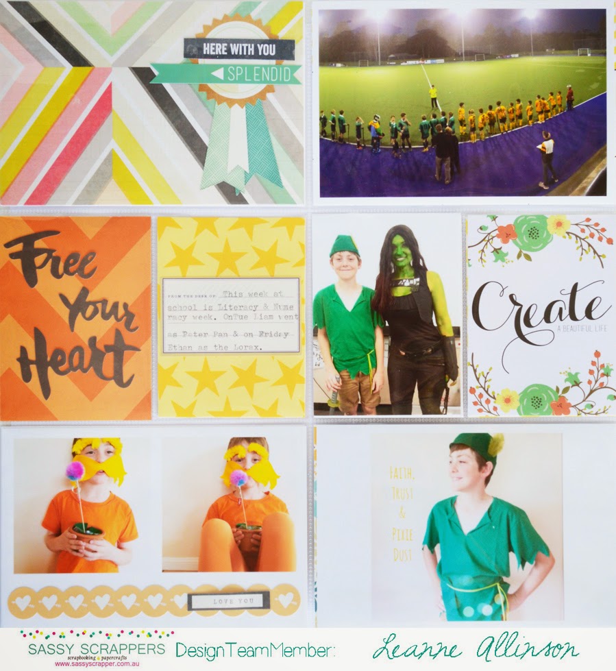 The Bella Blvd patterned papers are quite fun and light hearted. They were ideal to be placed adjacent to my photo collage of my 8 year old dressed as an orange and yellow Lorax. The sticker phrase 'Free Your Heart' adds interest to the patterned paper without it being lost on the page.