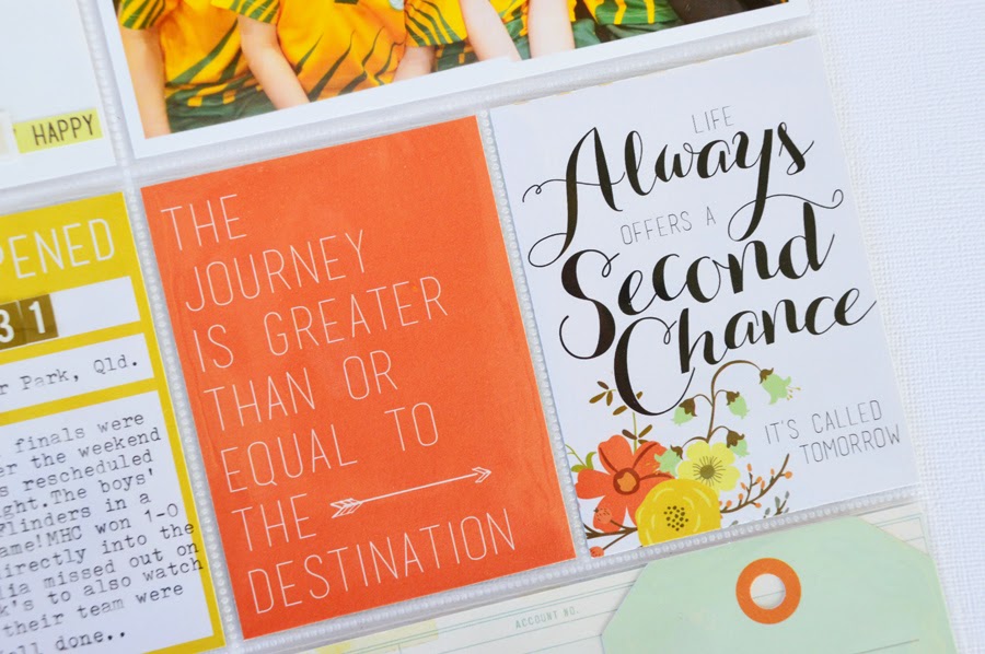 My spread this week was designed from the crazy colour combination of the yellow, orange and green found in my photos. My patterned papers were chosen to compliment each of the different stories from the week and to create movement across the spread. And where there were bold colours from the Bella Blvd & the Teresa Collins Designs filler cards (orange and yellow), the softer tones from the white TCD cards became the perfect combination to offset the frantic-ness.