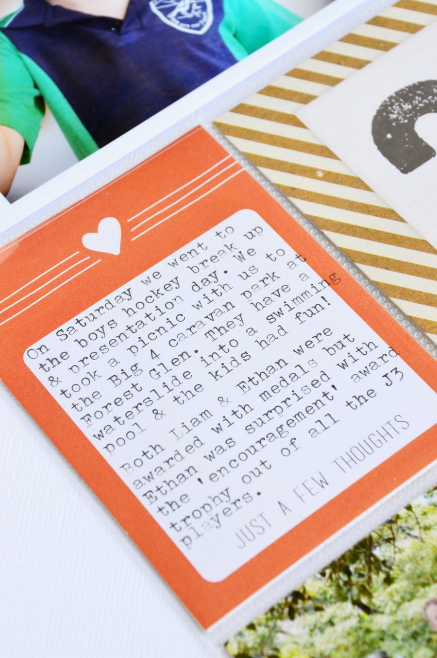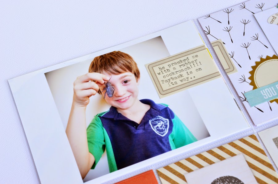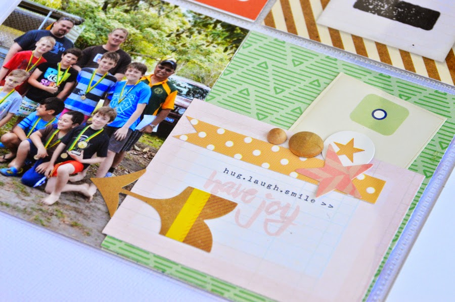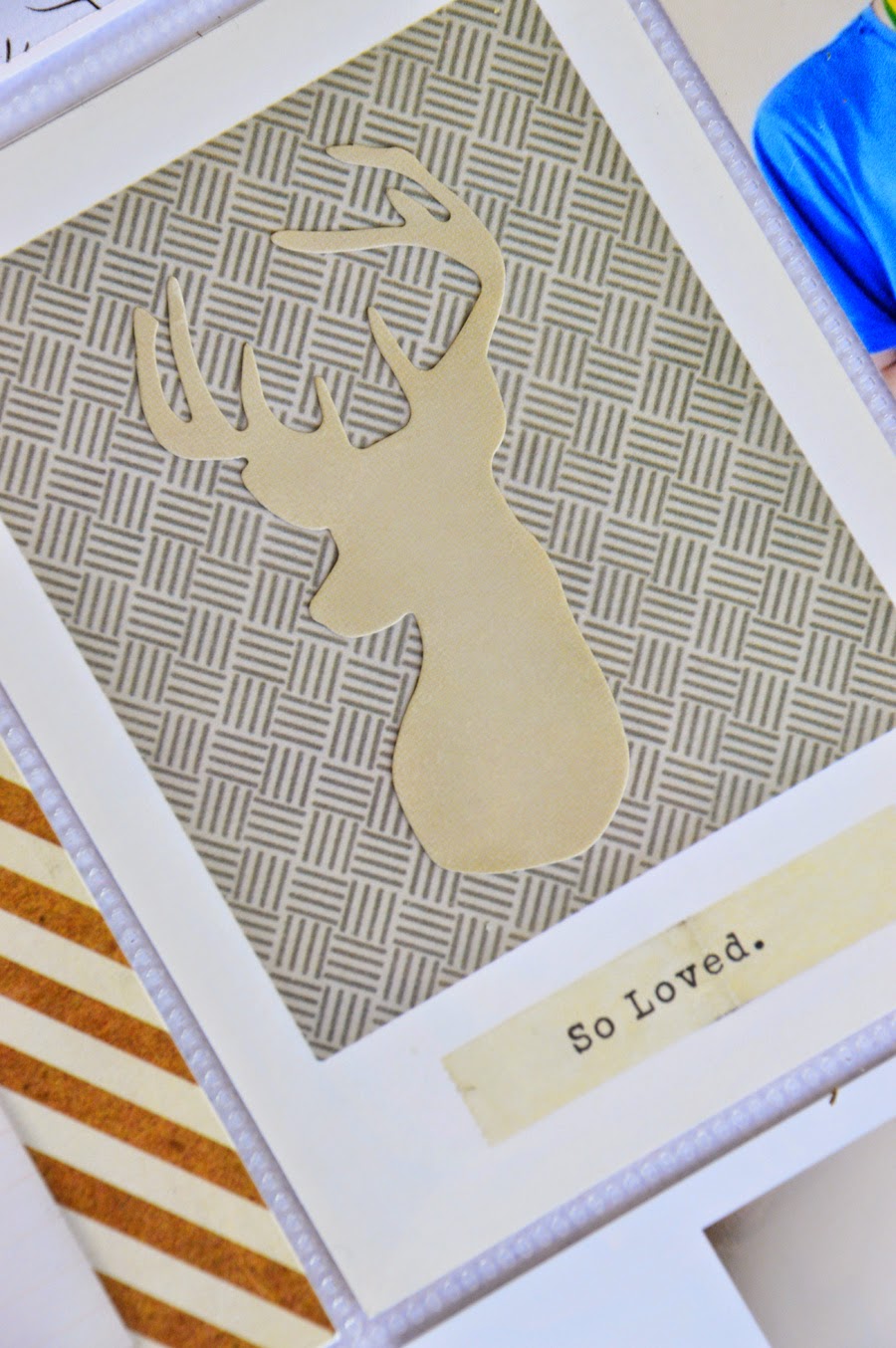 I have played with stickers quite a bit over the last few weeks. Most of the time they have helped create clusters and layers, but sometimes a sticker on it's own can make quite the statement. The deer head was too beautiful not to be used with these two collections. This pocket hasn't been overly embellished and symbolically, it reminds me of my own two young "bucks" - Liam & Ethan. If you note from the main photo of page one, I have even included a number "2" next to the deer head. *grin* Sometimes there is method to my madness!