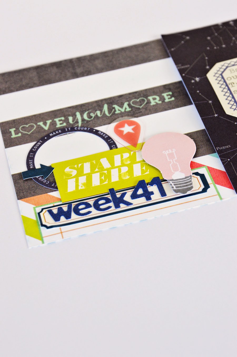 To create my weekly title pocket, the top left corner of the Dusk patterned paper, was trimmed to 4"x6" and layered with details from the September Skies ephemera pack, September Skies word strips, Jillibean Soup alphas and Echo Park label stickers.