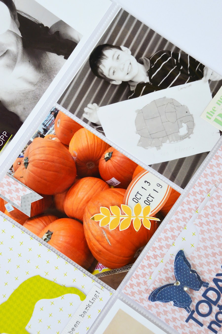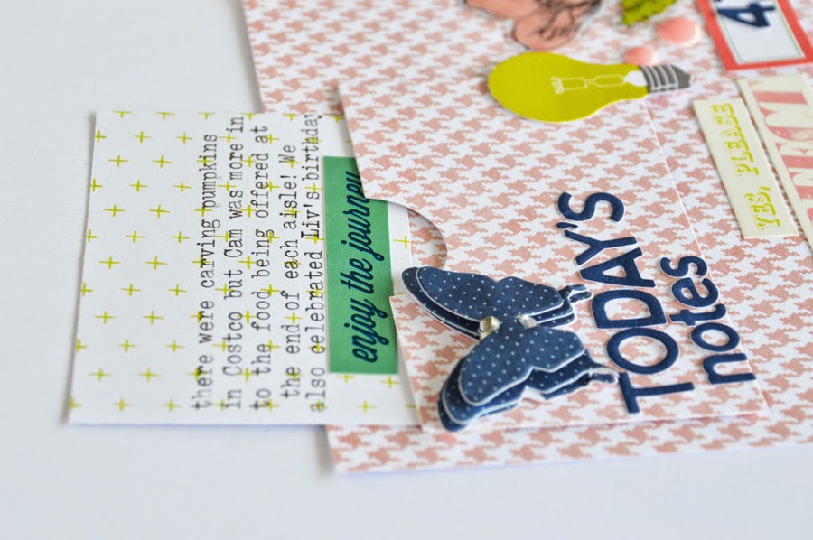 The photo which sparked the my PL process this week, contains the weekly dates. A Studio Calico label sticker adds just the right amount of white to the photo while the grey and pink banner softens the bright orange glow of the pumpkins stack.