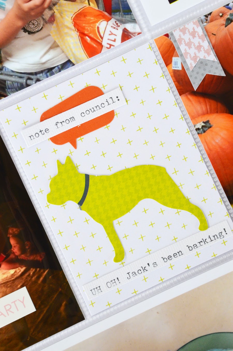 When I saw this dog shaped ephemera in the September Skies pack, I created this cheeky filler card. Coincidently, timing couldn't be better for its use this week. We received a friendly notice from one of our neighbours letting us know that our dog likes to bark while we are away from the house. It is all a part of documenting the good, the bad and sometimes embarrassing. It also gave me an opportunity to introduce a little more orange and another speech bubble.