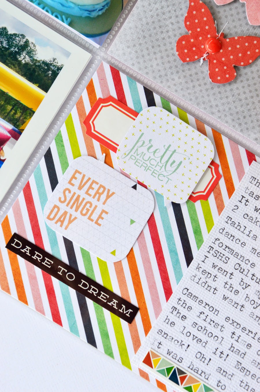 Writing on photos, or in this case, typing directly on my photo was in part to balance the look of Photoshop journaling from the first page. The puffy sicker arrow and the navy blue alphas provide a visual triangle on the overall spread.
