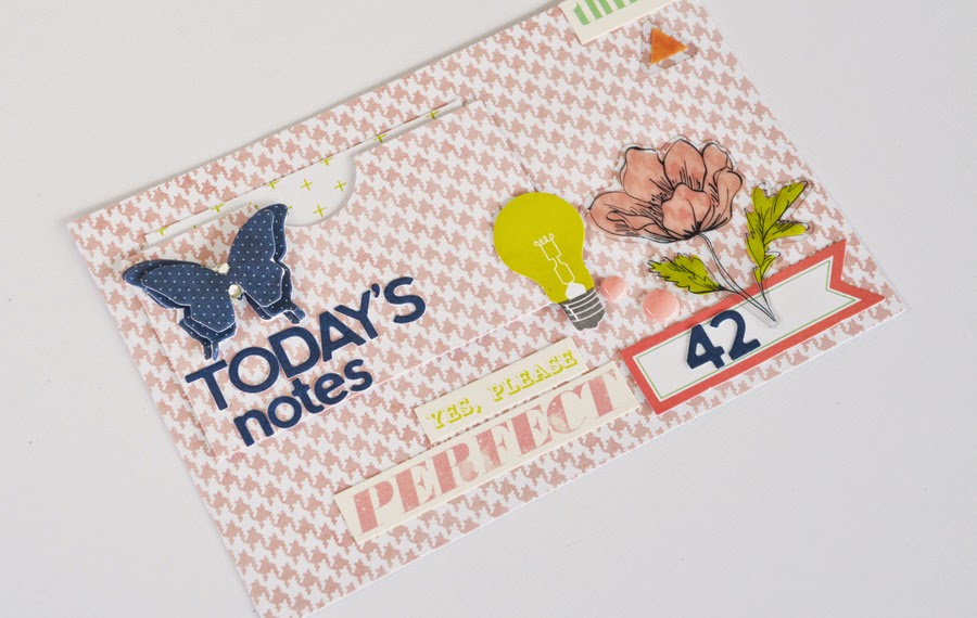 The front of the paper pocket had a circle notch trimmed to the top centre and then mounted on thin strips of foam tape to allow easy access for the note card to slip behind.