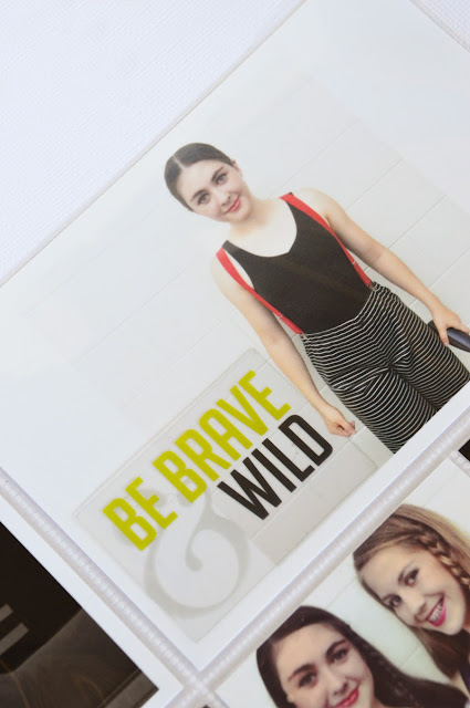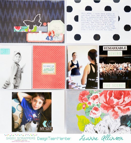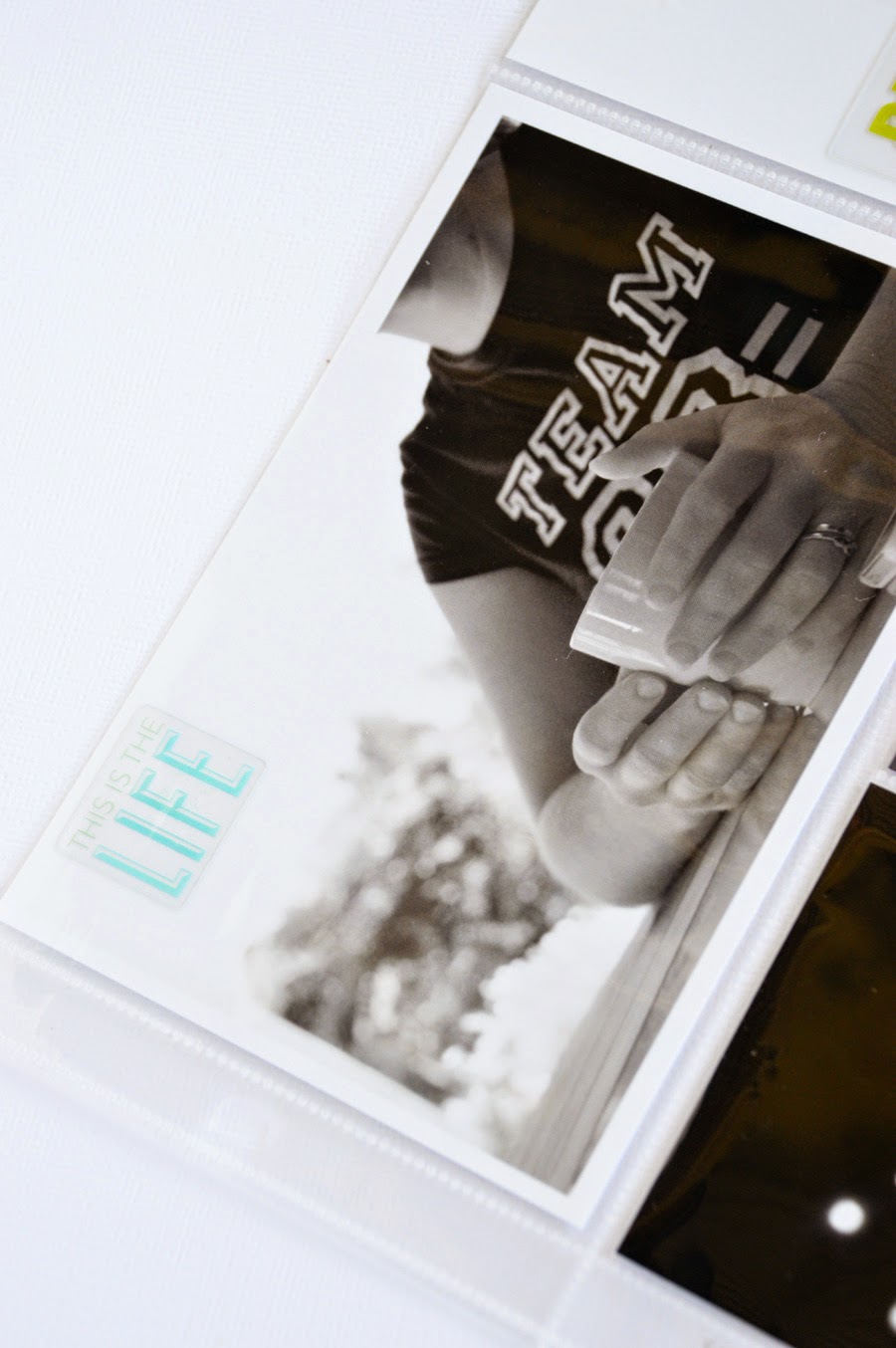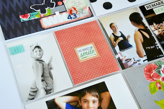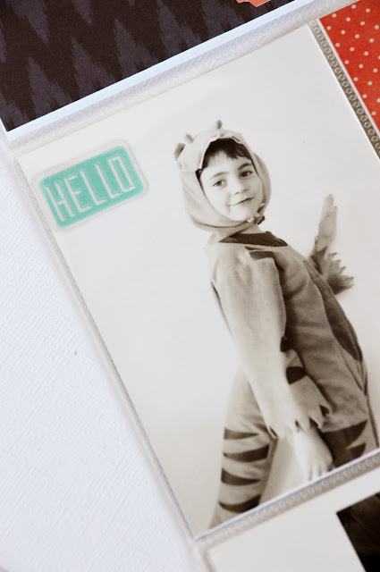 However, some moments recorded, were more like milestones. My youngest is quickly learning to read and write, but I can't include each piece of paper he writes on. A quick photo of him holding his *grin* impressive work has been teamed up with words typed directly to the patterned paper. A cluster of simple embellishments helps to draw the eye to this pocket.