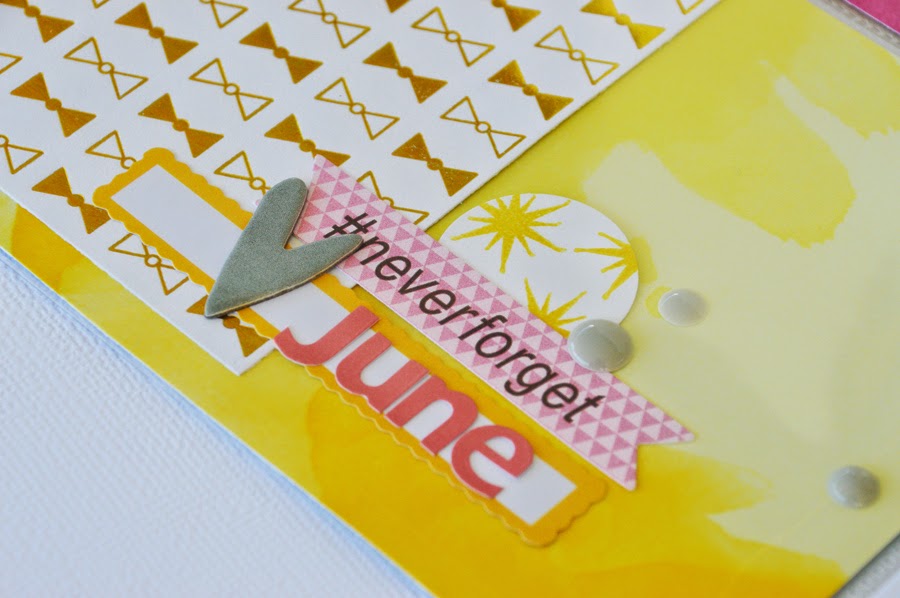 On the first page, the yellow/gold hues are a standout. Combined, they highlight my son's batman costume, other clothing and even his artwork. The yellow washi tape layered with the chipboard heart also subtly mimics his striped jumper!