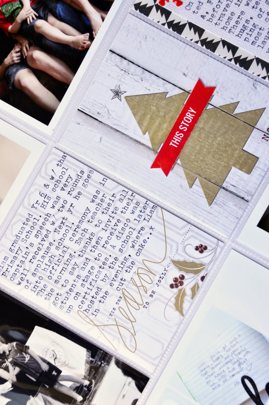 The filler cards this week are also from the Teresa Collins 3"x4" cards patterned paper. The tree card was simply layered with a banner from the Pretty Little Studio collection. Not only is the red colour the perfect pop on the page, but the title leads the eye to the series of journaling on either side.