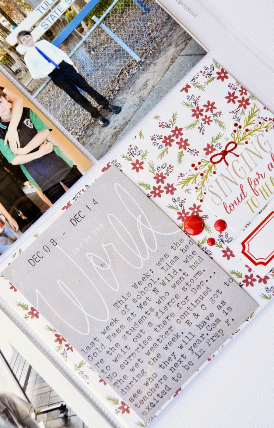 So many varied events in the span of one week. I am so glad that the colours and tones in the December Project Life kit are versatile and can accommodate another photo heavy spread. However, because it is December and preparing for Christmas is on my mind at the moment, I have been able to subtly communicate this with embellishment touches.