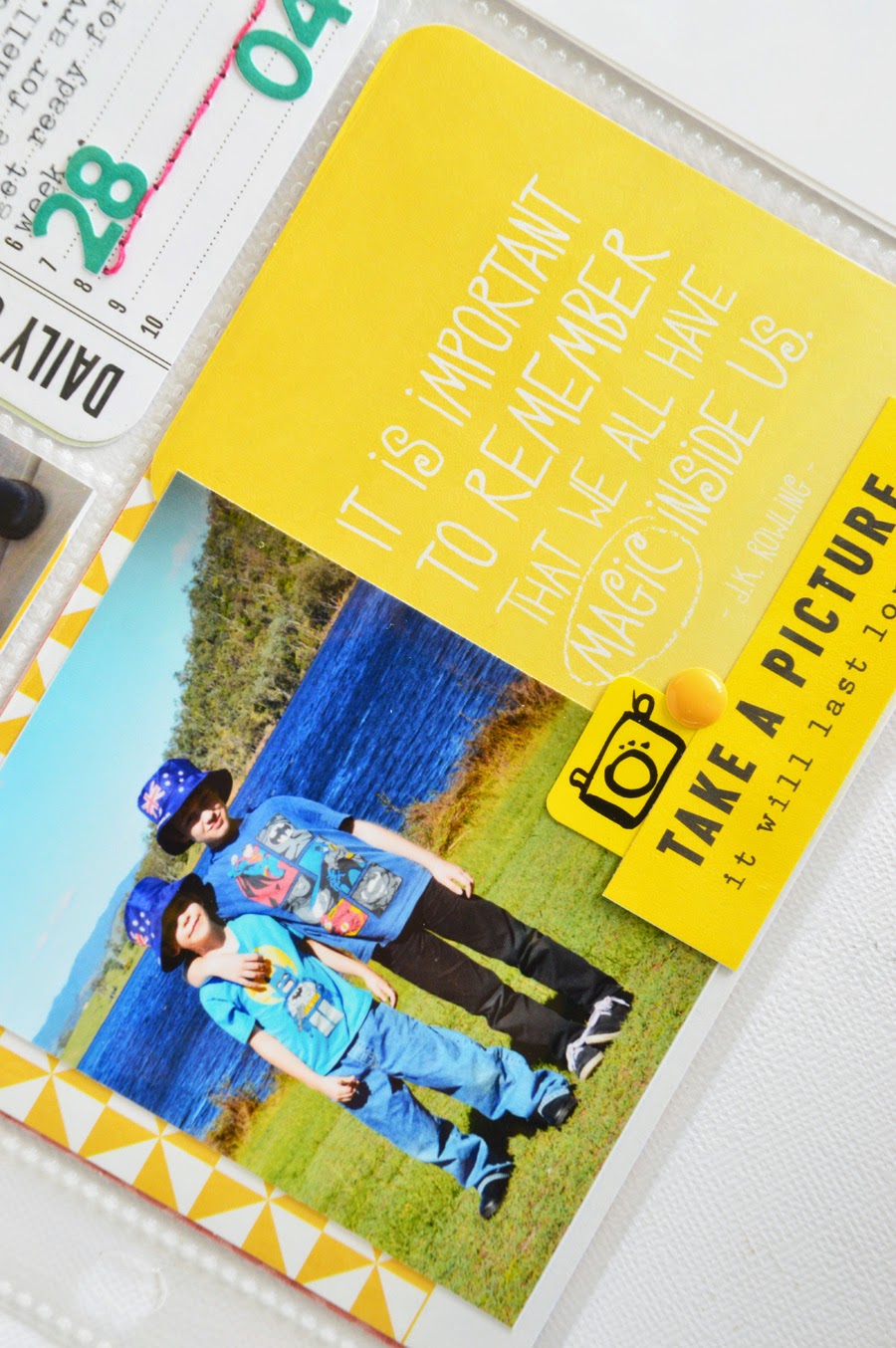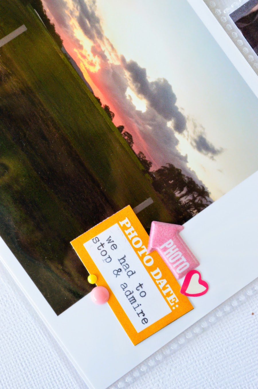 This week was all about paring the layers down and keeping my spread really simple. I wanted the colours to shine and the story to be told. However, among all the brightness of yellow and hot pink colour pops, I have added the subtleties of black and white photos and plenty of white space.
