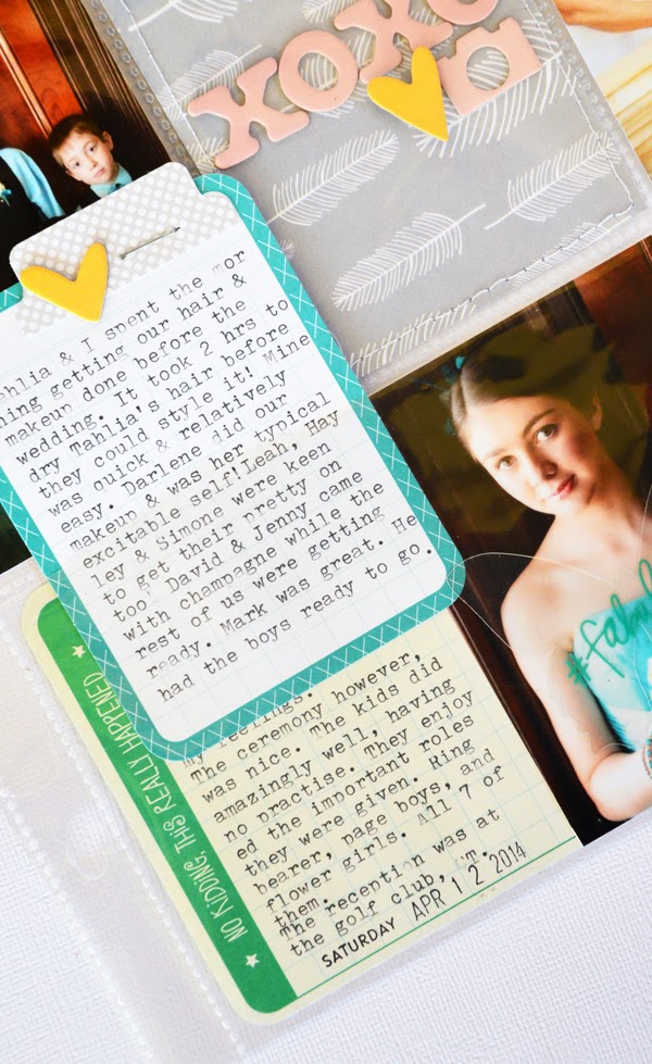 On page two, access to my hidden journaling is a lot easier. I've simply added a photo to one side of a large (4"x6") journaling card and typed my text directly onto the free space adjacent. To add even more story details, I've ran a second, smaller (3"x4") journaling card through my typewriter and attached a punched "tab" near the top of it.