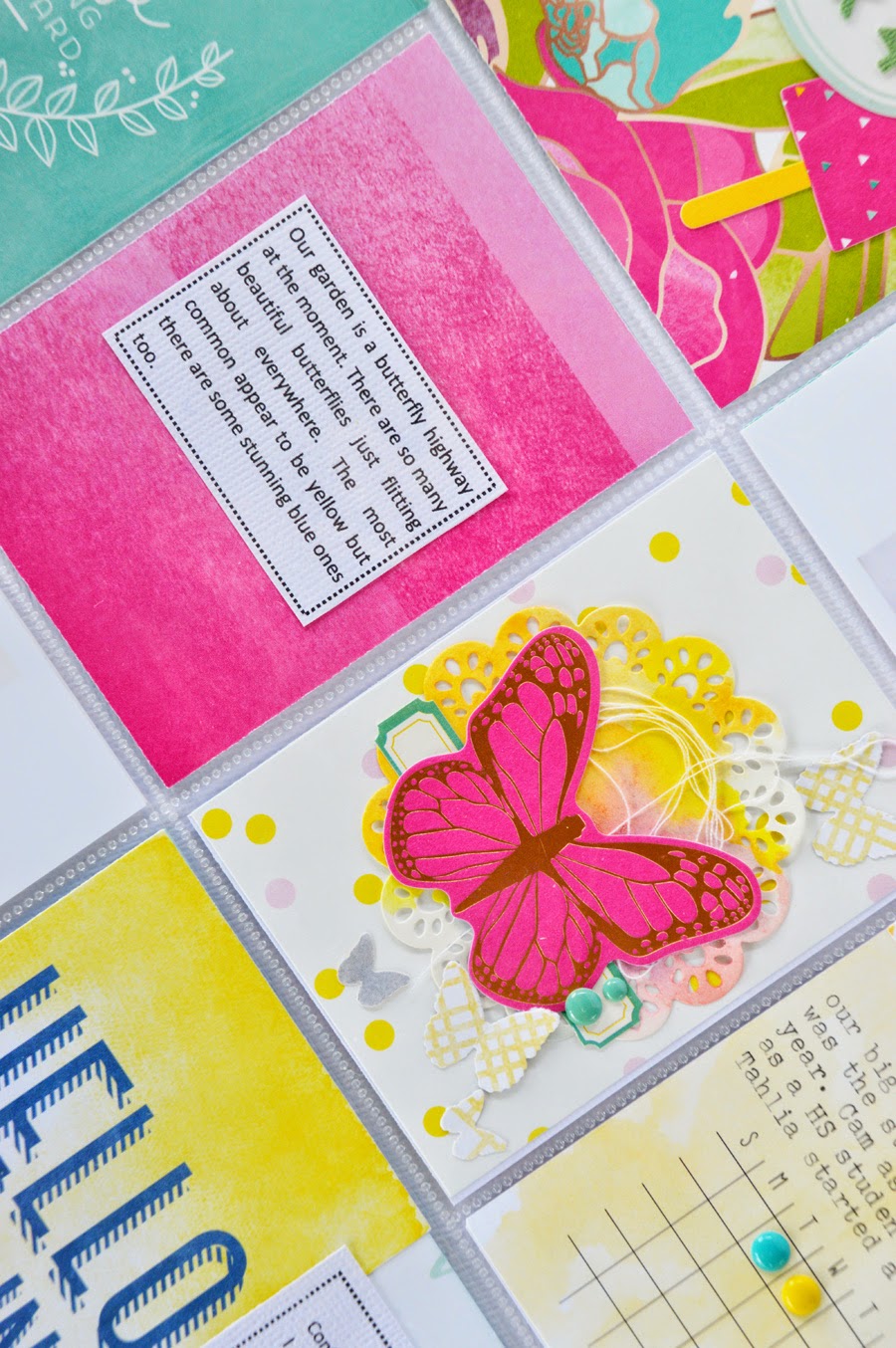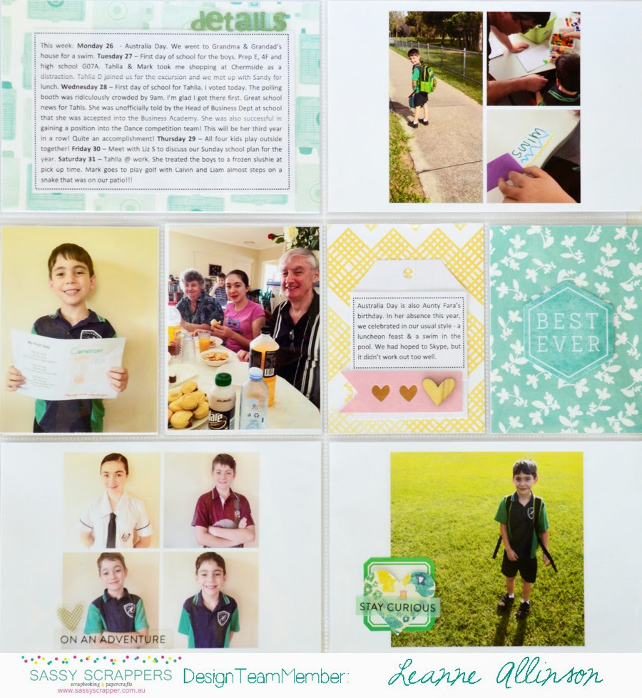 I love the beautiful colour combinations in these collections. And I certainly don't mind using pink ombre hues in pockets next to my boys! This week I have used the patterned papers to my advantage. I have very few photos, surprising really, considering it was the first week back at school for the new year. But I did want to journal more about the emotions I was experiencing, with not only my youngest starting school, but my daughter becoming a senior in High School, my eldest son starting his High School journey and my middle son moving up into the middle school at Primary. It really was a gargantuan start to a school year and quite frankly, I needed more journaling than photos this week! My process for this spread was to date and document and use the patterned papers to draw attention to my stories.