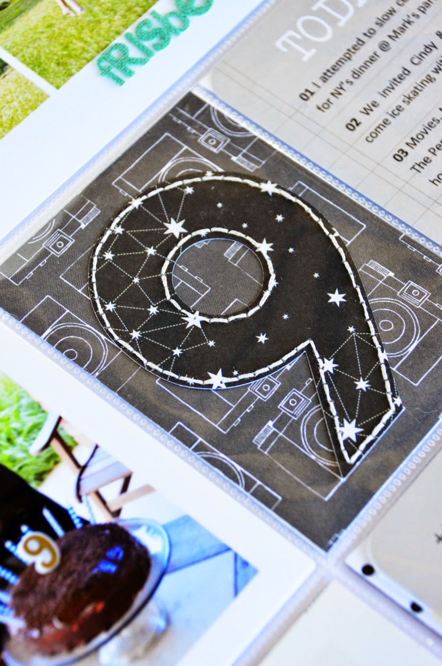 One of my pocket filler cards has been dedicated to my son's 9th birthday. I trimmed a background patterned paper sheet to 3"x4" and then using my silhouette, cut a number nine from a similar coloured paper. I made sure the number was large enough to fill the space on my filler card, so it would stand out. To finish it off, I hand stitched around the inner edge of the "9" with white embroidery floss.