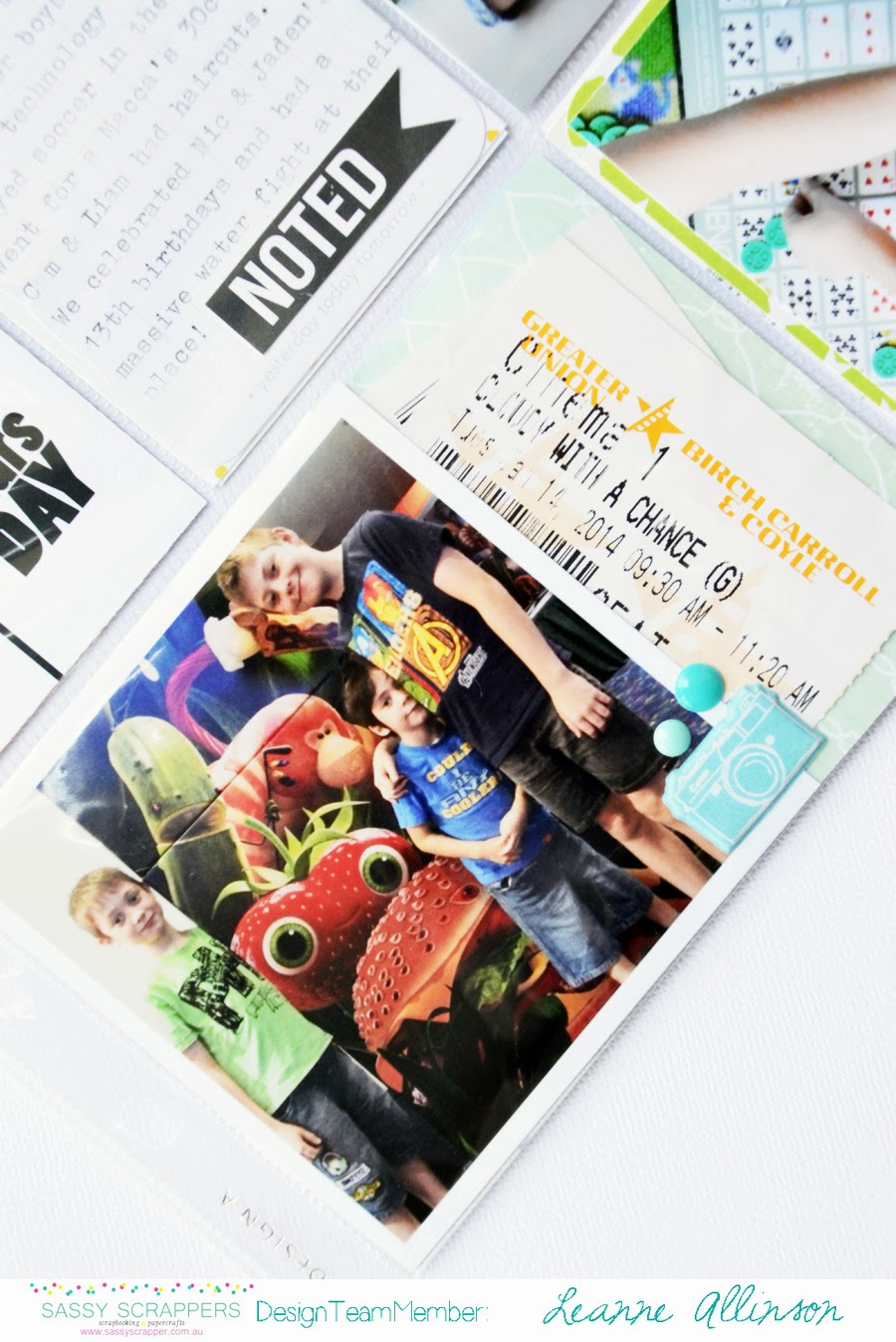 I think it helps that my middle son was wearing his favourite green shirt but the blue skies and monster mask, certainly helped me chose my complimentary colour. With the photos that didn't have any connection to the colour story, I simply converted to black and white. But again you will notice that they have been grounded with black and white embellishments or patterned paper in small amounts, to balance the full weekly spread.