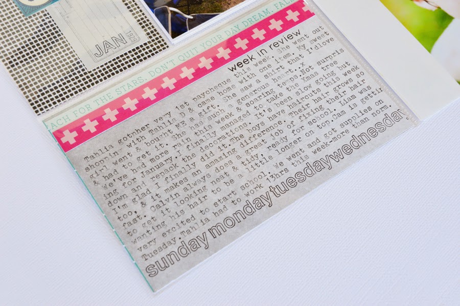 My goal this year, is to write and share more of our story/daily routines. I love the idea of having a pocket card, reserved just for a "Week in Review". I've typed up my journaling directly to the Amy Tangerine patterned paper and embellished it with clear stamps and strips of paper borders.