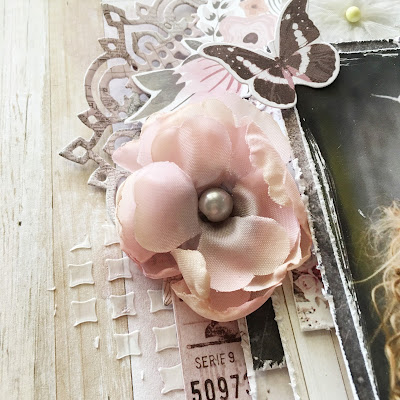 Can we all just stop a minute to get dreamy over this flower?? SWOON! Whilst not part of the Rose Quartz collection it is still a perfect match.You can find lots of Prima blooms in store. I also used a little modelling paste with a stencil for the background.It just gives a gentle, texture effect.