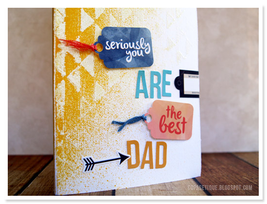 I've used a embossing powder with mist for a resist effect on the front, along with some super cute mini tag stickers. The black sticker works to keep the front on the card closed.
