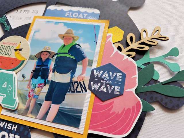 I started off by finding a ship's wheel cut file and cut it out from the dark blue paper in the Island Escape collection. I used foam tape to pop it up off the page. I also cut some strips from the 'Borders' paper in the Island Escape collection to add to the left side of the layout! I like the pop of pink and the addition the floral also brings.