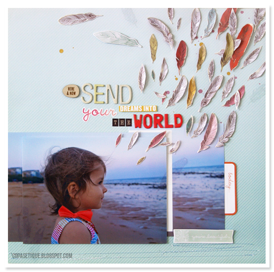 I absolutely love looking at this picture of my daughter. She looks so peaceful. It's as if time has stood still for a moment, while she contemplates life.This month, I've been creating with the Sundrifter collection by Studio Calico. When I first saw a sheet of the 'Pocohontas' paper, I knew straight away that I wanted to use the feathers as embellishments. I think they give a sense of movement to the page, enhancing the feeling of the wind and also representing her little thoughts blowing out on the breeze. I've added a few stamped feathers as well, both onto the paper and photos.The title makes use of some AC 'Ombre Limeade' thickers as well as some gorgeous Sundrifter wood veneer phrases. There are also Sundrifter stickers and a snippet from a sheet of 'Beautiful'. Some mixed stitching in matching hues to echo the sea and hidden journaling behind the photo. It's such a versatile collection - I'm sure you'll have loads of fun with it!Thanks for popping in today! Chantalle