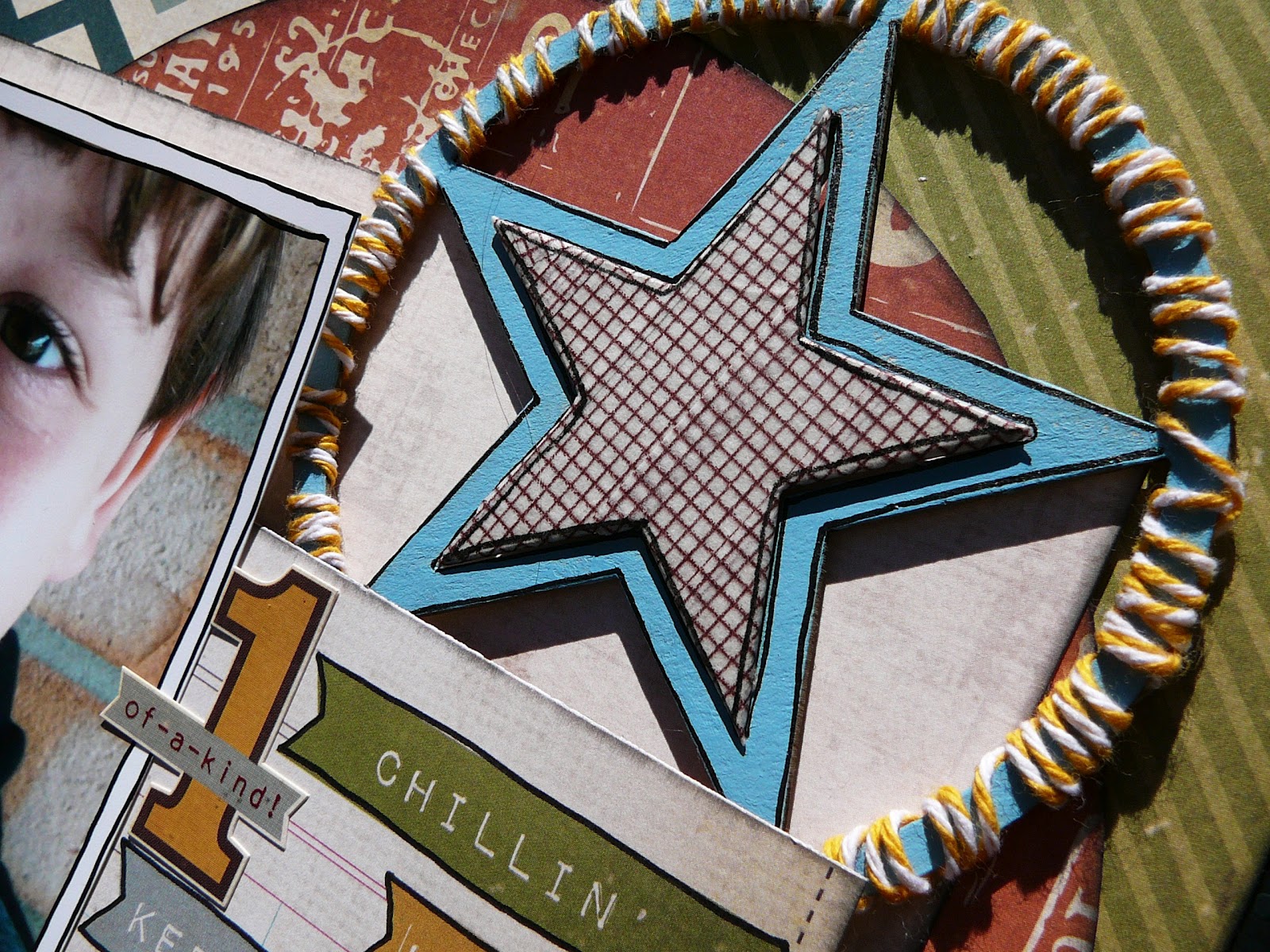 This is another chipboard, that I've painted, washi taped, and wrapped some twine around, to add a bit of texture to the page. I've outlined some of the elements in black pen to make them stand out too.