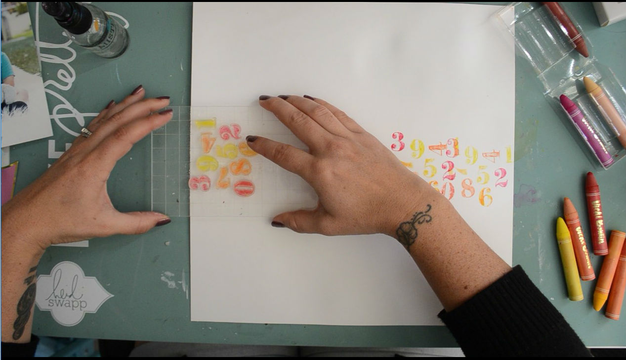 I then used the number stamps from Vicki Boutin Mixed Media Stamps & Dies - Floral and drew on them using Vicki Boutin Art Crayons Set 1. To activate the crayons I then sprayed the stamps with water and stamped onto my layout.