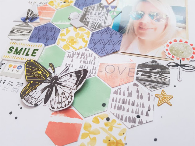 I like how the different colours look mixed together in the hexagon shapes. I added a few triangle embellishments to break up the triangles a little bit. The butterflies in this collection are my absolute favourite so I just had to include my very last one that I was hoarding on this layout!