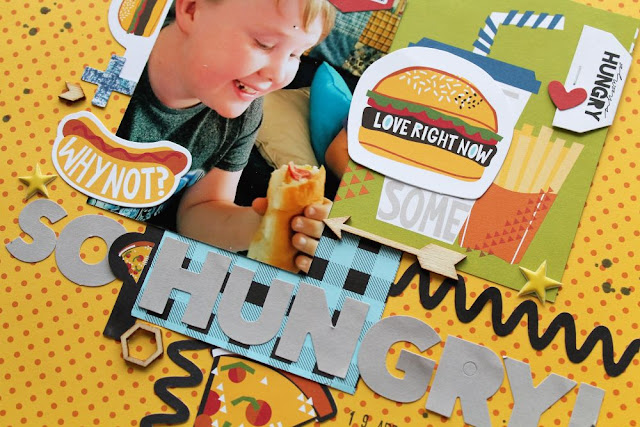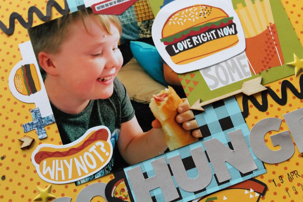 When I saw all the food related ephemera pieces in the Alex collection I just knew I had the perfect photo to use on this layout! My 11 year old certainly likes to think with his stomach so this layout is him to a tee! I added lots of the food related die-cuts to compliment my layout plus some of the wood veneer and stickers too!