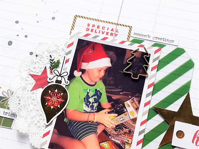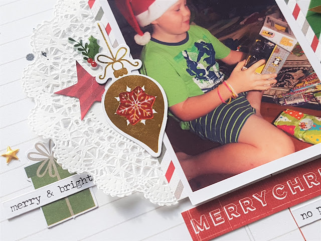 To the left of my photo you can see I built a small cluster of embellishments including the gold bauble with an acetate snowflake over the top, a red star and a holly puffy sticker. I also felt it need that green present and a phrase sticker to bring in a little extra something to that side of my page.