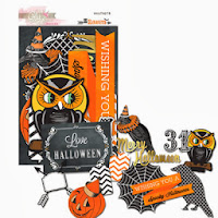 Once your stand has been slotted into the base and you've threaded your mini calendar onto the stand, you are ready to decorate! I have used some bits and pieces of Raven ephemera along with some Rhinestones. I've misted the bat and witch chippies with some Heidi Swapp Black Velvet Color Shine and added some shine with glossy accents. The tree is actually a sticker that I have backed with some black paper and fussy cut.