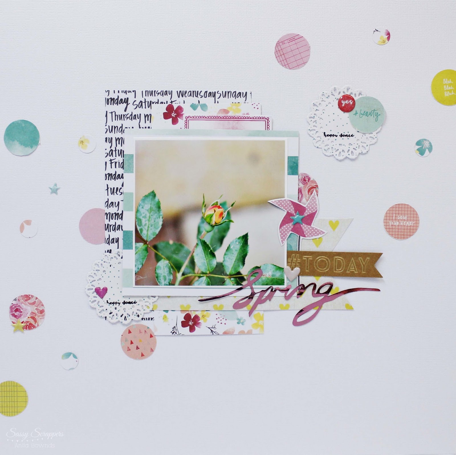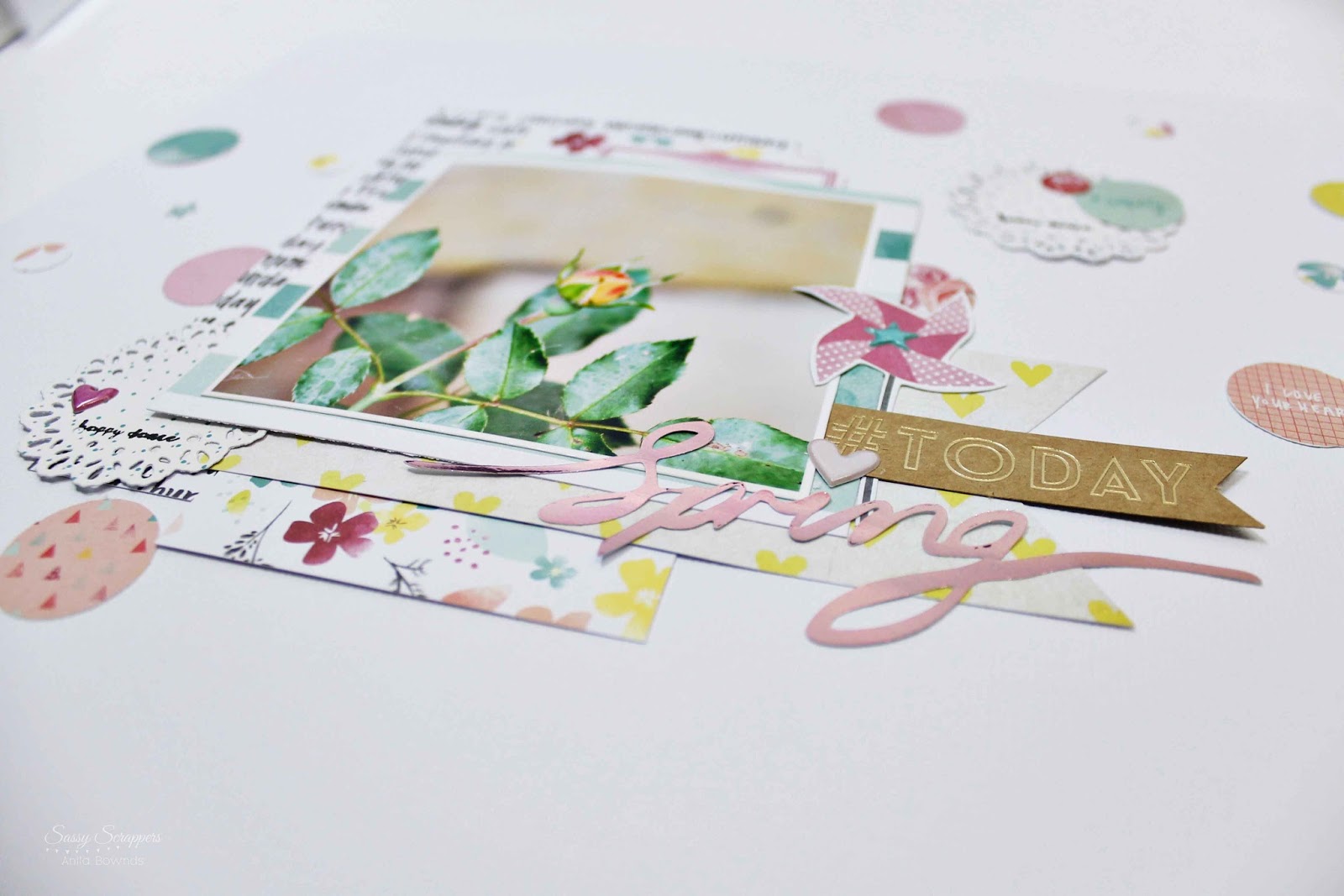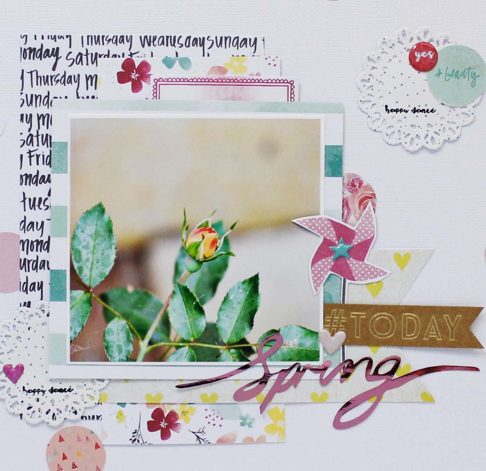 Then using a mini Doily die cuts I added 2 to my page and embellished with stickers and the word happy dance using the roller phrase stamp